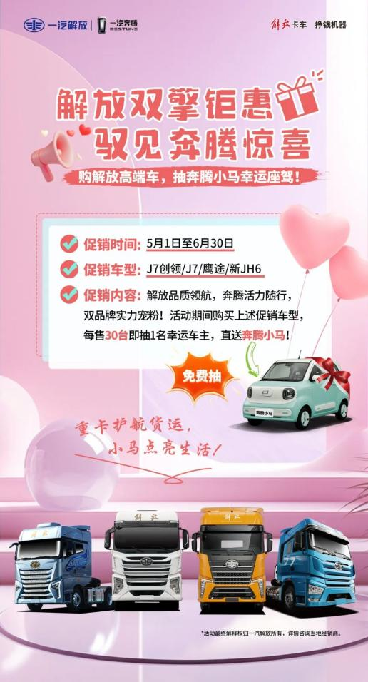 5月1日至6月30日,一汽解放&一汽奔腾两大自主品牌联袂实力宠粉!活动期间,凡购买一汽解放J7创领版/J7/鹰途/新JH6高端车型,即可参与抽奖,每售30台上述车型即抽1名幸运车主,直送奔腾小马幸运座驾。让解放卡车护航运输,奔腾小马点亮生活。